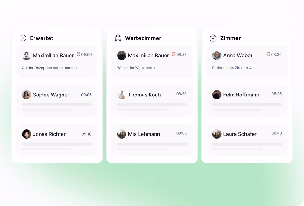 Alle Check-in-Schritte werden als To-dos dargestellt, sodass das Empfangsteam jederzeit den Überblick über offene Aufgaben und den Aufenthaltsort der Patient:innen behält.